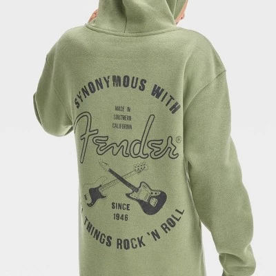 Your music enthusiast will love rocking this Fender Guitar Pullover Hoodie from art class™ anywhere they go. The green pullover sweatshirt sports the Fender logo written down the left sleeve and a two-guitar graphic plus the iconic slogan “Synonymous with All Things Rock N’ Roll” on the back for an authentic, fan-favorite look. Made of a midweight cotton blend, this graphic sweatshirt has a head-warming hood and hands-warming kangaroo pocket, along with dropped shoulders for laid-back vibes.