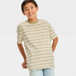 This Short-Sleeve Graphic T-Shirt with Horizontal Stripes from art class™ is a great pick for casual outings. Crafted from 100% cotton, this short-sleeve T-shirt brings cool comfort to their day. Designed in an oversized silhouette with a length that hits below the hip for wearing tucked in or untucked, this crewneck tee features horizontal stripes in olive green, brown and white for classic style.