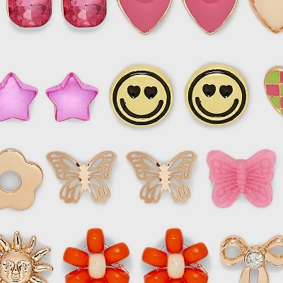 The Girls’ 20pk Earring Set with Bows Strawberries Hearts – art class⢠is a fun addition to any young fashionista’s jewelry collection. The set features stars, butterflies, flowers, hearts, mushrooms, bows and more. Each earring comes in a vibrant color to add a cheerful upgrade. Whether for everyday wear or occasional styling, this girls’ 20pk earring set from art class⢠offers a range of options to suit different preferences and occasions.