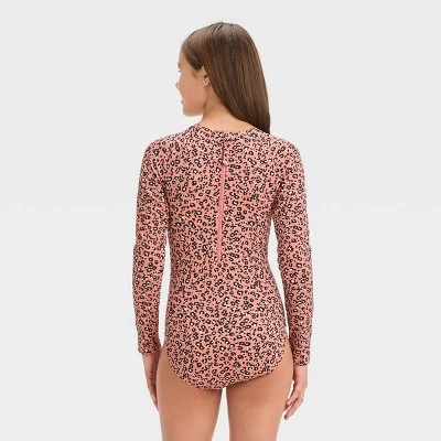 Add an eye-catching look to their swimwear with this Leopard Spots One-Piece Rash Guard from art classâ˘. This long-sleeve rash guard swimsuit features a black leopard spots pattern detailed with top stitching on a contrasting-color background and has a cutout middle for a stylish look. Made from 4-way stretch opaque fabric, it offers flexible comfort and modest coverage both in and out of the water. The back half-length zipper allows for easy dressing and removal, and the UPF 50+ rated material provides added protection from UV rays.