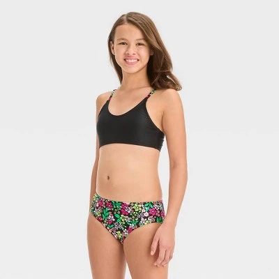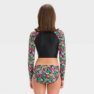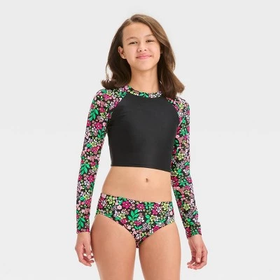 From playing in the pool to relaxing at the beach, your child will stay comfortable in this Floral Printed Rash Guard Set from art class™. This swimsuit set includes a long-sleeve rash guard, a bikini swim top with spaghetti straps and bikini swim bottom to keep them covered under the sun. Each piece in this set is crafted from a soft and stretchy fabric for comfy wear in or out of the water. Plus, the pieces feature UPF 50+ rated material that offers them UV protection. Designed with raglan sleeves showcasing a colorful floral print and featuring a cropped length, the black rash guard makes a fun pairing with the floral-print bikini bottoms and black swim top.