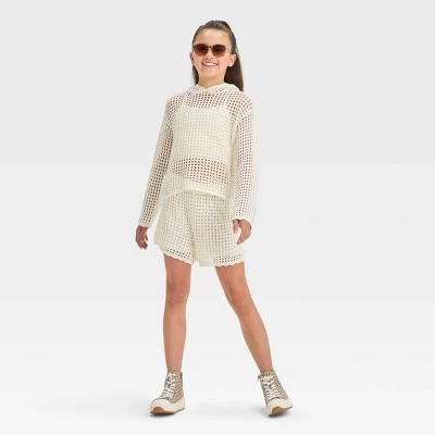 Your child will love creating an array of warm-weather looks with these Open Knit Pull-On Sweater Shorts from art class™. Tailored in a relaxed fit, these mid-rise shorts are crafted from midweight fabric for cool and comfortable wear. Designed in a solid hue, these pull-on shorts feature an open-knit sweater design with a scalloped hem for cute style. Plus, they’re designed with full lining for coverage and confident wear.