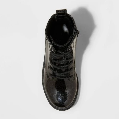 Add some shine and sparkle to your kid’s footwear collection with these Rochelle Glitter Zipper Lace-Up Combat Boots from art class™. The no-heel boots feature a round-toe design with comfy lining and insoles to help them walk in comfort. The faux-leather upper with an allover glitter look and front lace-up design lends stunning appeal that instantly brightens up any outfit. A side zipper and elastic panel at the back complete the look with easy on/off and a secure fit.