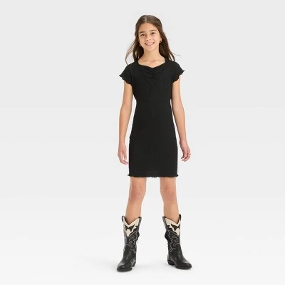 Add flair to your child’s everyday wardrobe with this Short-Sleeve Knit Cinch Neck Dress from art class™. This mini length dress in a solid color features a cinched sweetheart neck, a textured construction and lettuce frills at the trim for sweet style. The stretchy knit fabric ensures flexible movement, and a comfy fit, while the pullover design allows for easy wear. They can add their favorite footwear to complete the look.